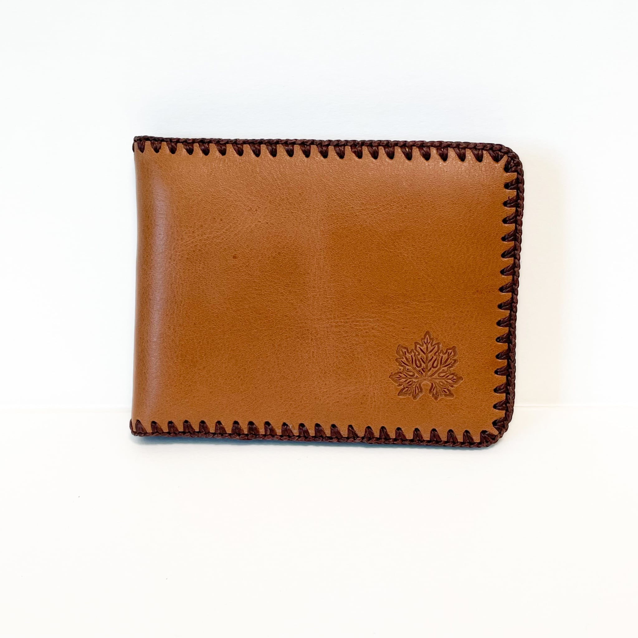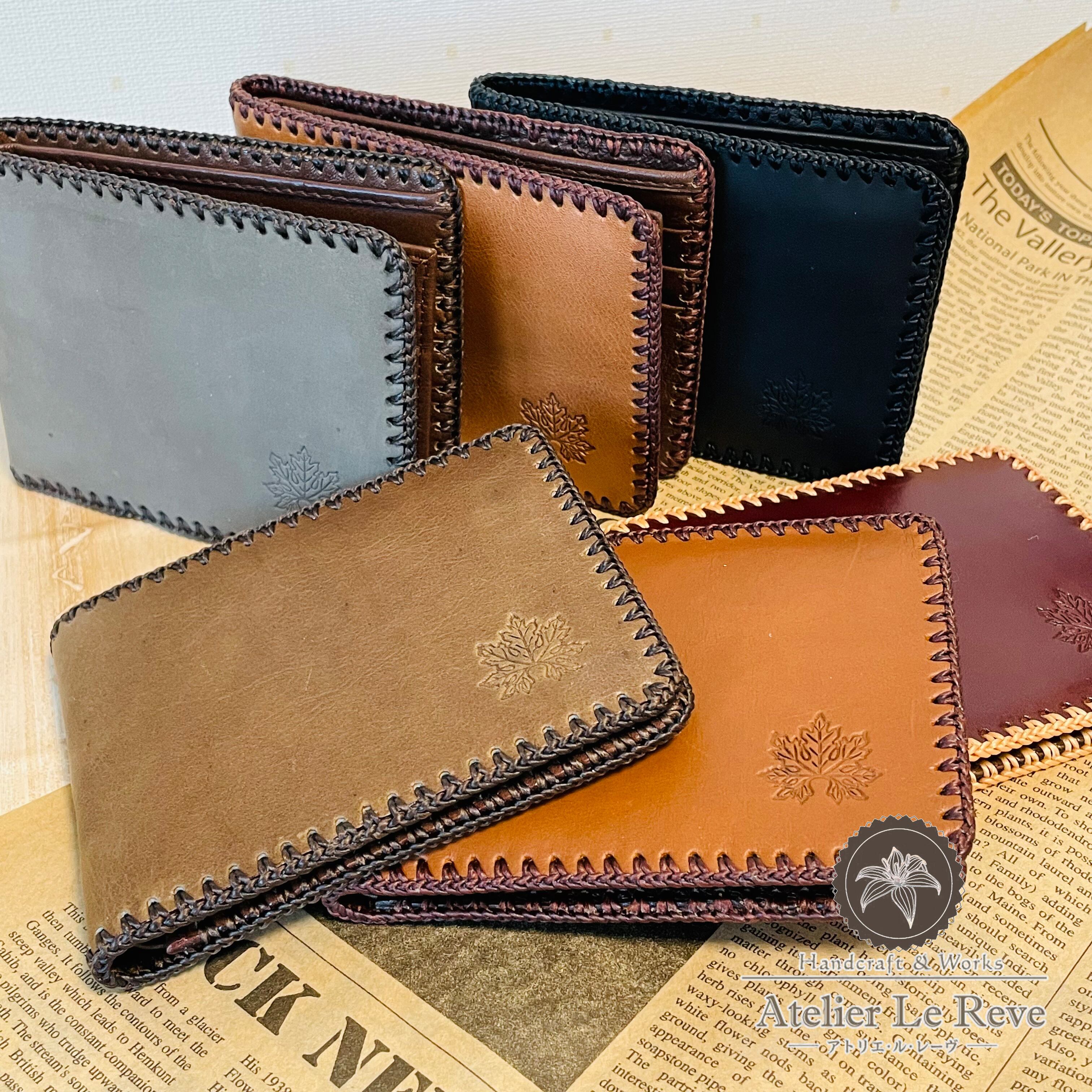 アクセントにリーフ模様の刻印を入れた、二つ折りの牛本革財布です。